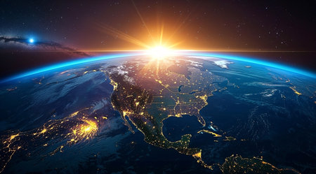 View of earth from space showing north america illuminated by city lights at dawn. this global perspective highlights human presence and technological advancement.