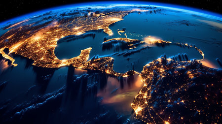 Generative AI : Planet Earth At Night North and Central America at night viewed from space with city lights USA Canada Mexico Cuba Jamaica Bahamas Belize GuatemalaThis image elemen