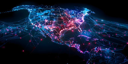 This visual representation illustrates North Americas connectivity through glowing network lights on a digital globe against a black background, showcasing the intricate web linking various regions