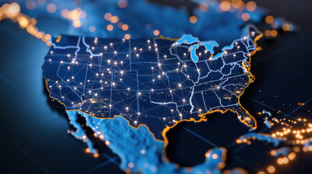A captivating digital illustration of the United States featuring bright connections and nighttime city lights. Perfect for technology and geography themes.