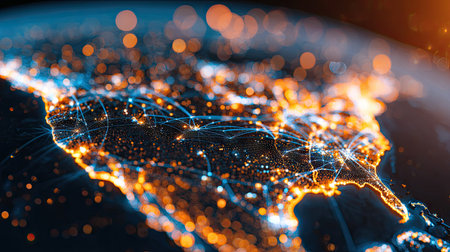 This image depicts a stylized representation of city lights connected by networks. The illustration features a dark background, illuminated by an array of bright, glowing points and connecting lines. It suggests a global or digital environment, potentially applicable for technology, communication, or data-related themes. The image could be used in various commercial or editorial contexts.