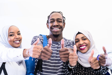 group portrait of happy african students standing together against white background and showing ok sign thumbs up girls wearing traiditional sudan muslim hijab fashion