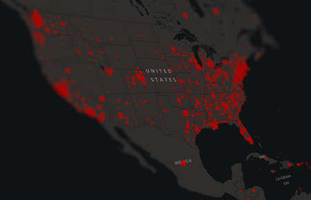 COVID-19 coronavirus pandemic on the US map in close-up with red dots of infection centers. The spread of coronavirus in the United States. Covid-19 infection concept new York.