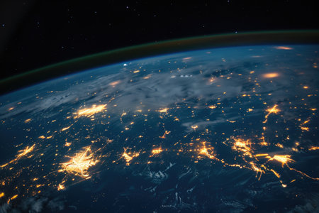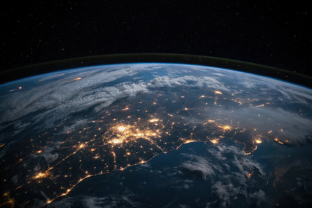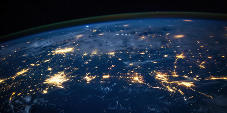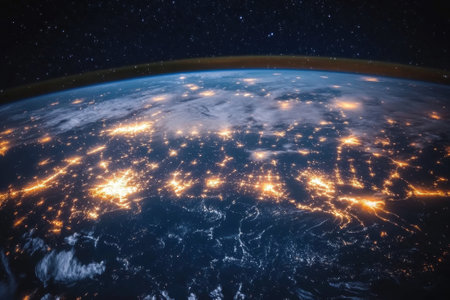 Night view of planet earth from space showing illuminated cities and stars