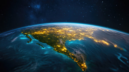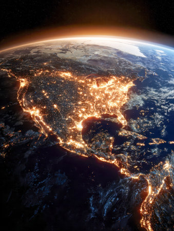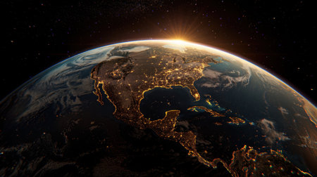 Stunning view of Earth from space, showcasing North America illuminated by city lights night. curvature of planet is visible, with beautiful sunrise horizon, creating sense of wonder
