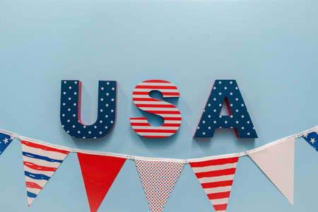 Painted USA sign with white, red and blue on blue background.
