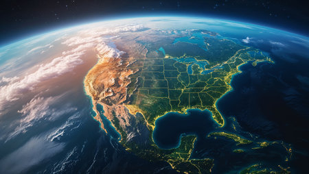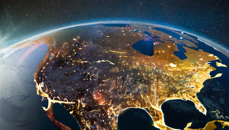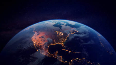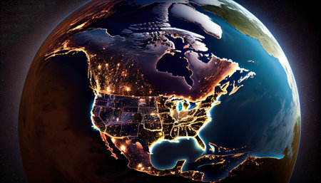 North America from space. 3D illustration with detailed planet surface and visible city lights.