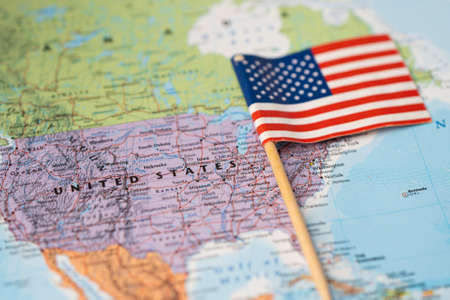 Small flag of USA on map, closeup