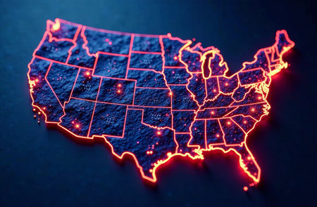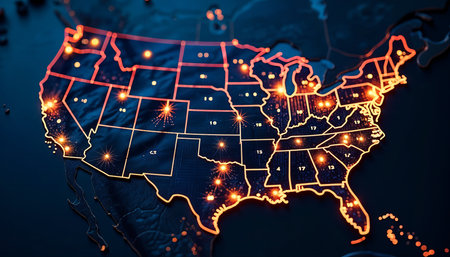 A vibrant outline of the United States is displayed, highlighting state borders with a luminous red glow. It captures the geographical layout and emphasizes major cities with glowing dots..
