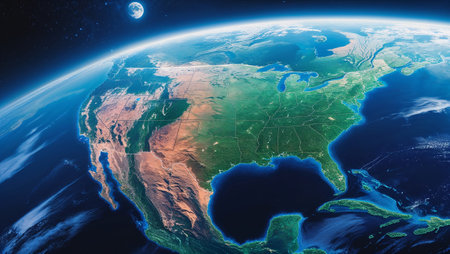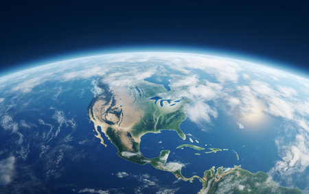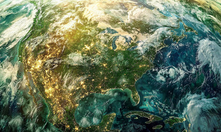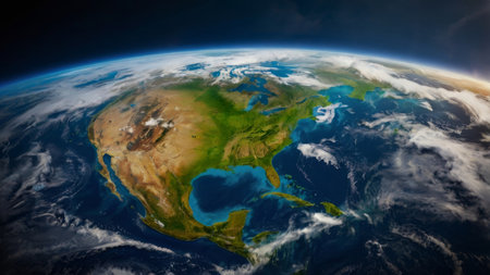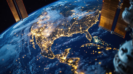 A breathtaking view of North America from orbit, showcasing city lights and the planet's atmospheric glow.