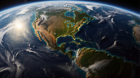 This captivating image showcases a breathtaking space view of Earth focusing on North America as the sun rises, illuminating the continent's varied terrain and expansive oceans, highlighting the beauty of our planet from above.