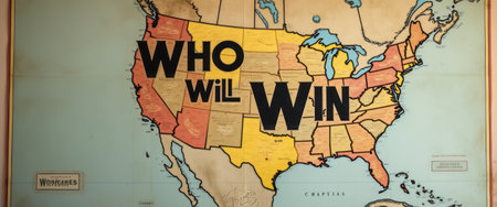 This striking vintage map of the United States features the bold question Who Will Win in large, eye-catching letters. The maps colorful state outlines create a vibrant backdrop, inviting viewers to ponder the excitement of competition and the spirit of rivalry across the nation.