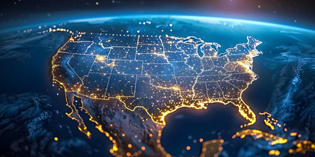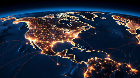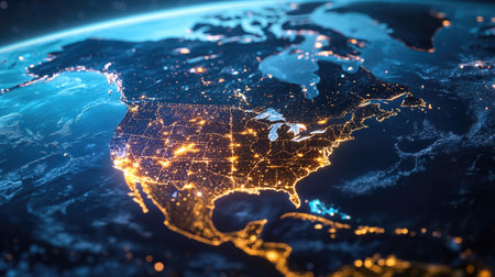 North America at night, digitally enhanced with glowing cityscapes and infused with futuristic technology, representing the intersection of geography and innovation.