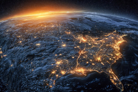 A stunning celestial view capturing lit-up urban centers across the us as dawn breaks, highlighting the nation's dynamic pulse from space and horizon glow.