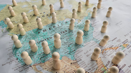 Examining the impact of population distribution in North America with wooden figures on a map