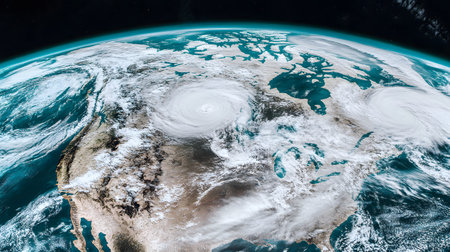 Stunning aerial view of Earth showcasing powerful hurricanes swirling over North America. A reminder of nature's force and beauty.