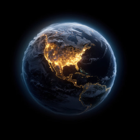 A cosmic perspective revealing vibrant urban glows across North and Central America as dawn's first light gently brightens the planet's edge from space.