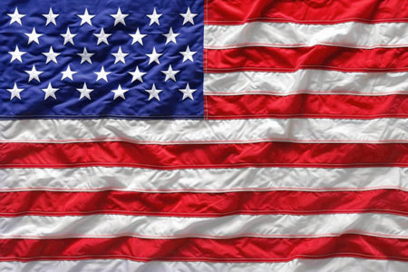 Close up heavy cotton canvas US national flag background, symbol of American patriotism, elevated high angle view, directly above