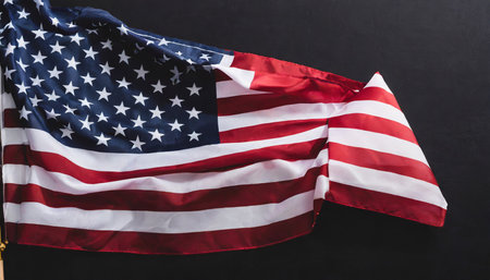 Close-up, the beautiful fabric American flag on black wooden background. Independence day concept.