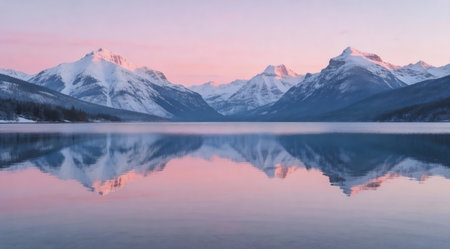 Captures profound tranquility via impeccable symmetrical mirroring and gentle dawn gradients in a refined digital vista composition. Suited for mindfulness apps, eco-tourism brochures, wellness branding, serene screensavers, or nature-themed editorial layouts appealing to outdoor enthusiasts and graphic professionals. Precise tonal balance of chilled blues against su... AI-generated illustration.