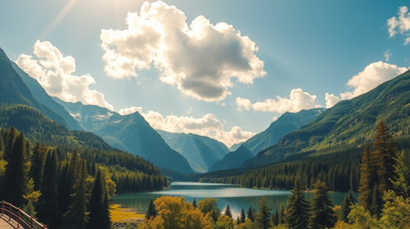 Stock showing a panoramic landscape of a serene alpine lake reflecting snow-capped mountains and lush green rolling hills bathed in the warm golden light of sunrise...