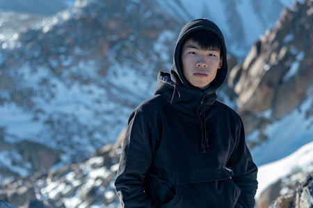Generative AI Image of Photo of Chinese Man Wearing Jacket Exploring a Snowy Mountain