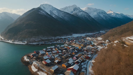 A vibrant village with colorful rooftops sits on the edge of a deep blue fjord, backed by imposing snow-covered mountains under a clear sky.