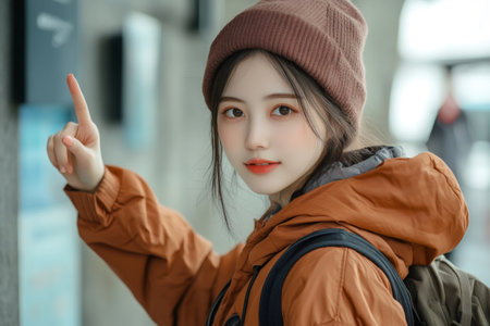 Stylish young woman wearing a beanie, winter coat, and backpack, pointing her finger towards something interesting