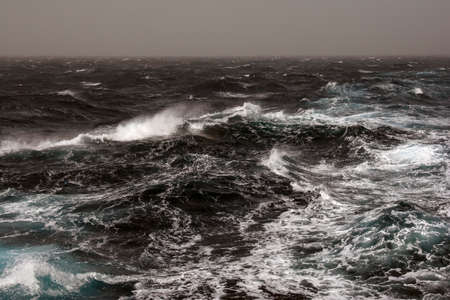 Boat wake waves in the Drake Passage, causing spray to come off the water.