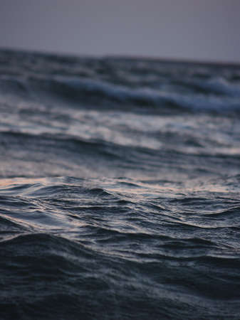 A dramatic close up shot of turbulent dark blue ocean waves from a low perspective with a soft colored sunset and clouds in the distant background.