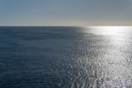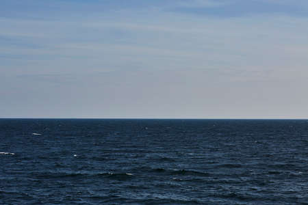 The Atlantic Ocean and clouds above the horizon in the blue sky. Sea view