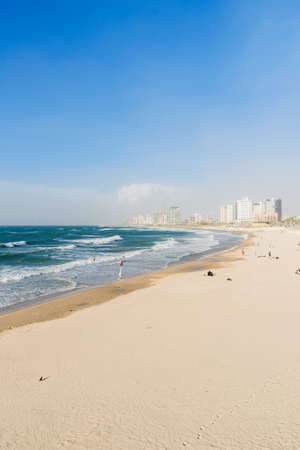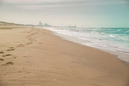 Sandy seashore with clear water and huge waves in the sea at sunny day with skyscrapers of the metropolis on the background.