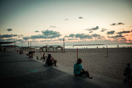 Tel Aviv Israel October 04, 2020 View of unidentified people without a face mask to protect themself having fun during the sunset in Tel Aviv beach despite lockdown and Coronavirus outbreak