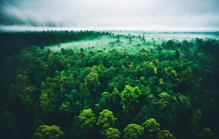 An overhead shot reveals a dense forest canopy, filled with vibrant green foliage. The scene is illuminated by sunlight filtering through the trees, creating a hazy effect with fog. The composition and lighting may be suitable for illustrating natural environments, ecosystem studies, or general commercial use.