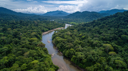 Aerial view of a pristine river flowing through a dense, vibrant rainforest, showcasing the beauty and biodiversity of nature