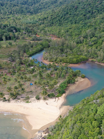 A breathtaking aerial view of a lush mangrove forest lining a winding river as it flows into calm coastal waters. This vibrant landscape captures nature's serenity and beauty.