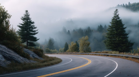 A tranquil curved road meanders through a misty forest landscape, with lush trees and soft fog creating a serene and picturesque setting. Perfect for nature lovers.