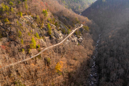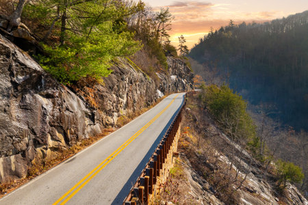 Scenic journey through Highlands Road in North Carolina. Rocky mountainsides and fall forest canopy create a stunning autumn drive