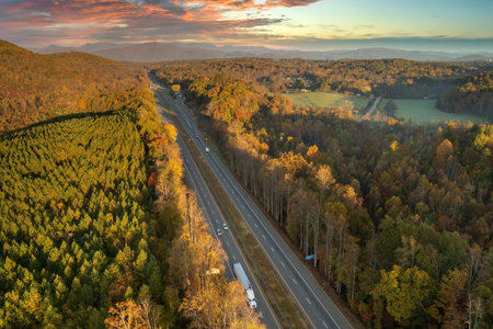 Aerial view of I-40 freeway in North Carolina heading to Asheville through Appalachian mountains in golden fall with moving trucks and cars. Interstate transportation concept