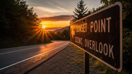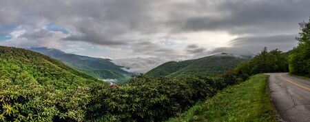 Road trip travel in Appalachian mountains at sunset. Mt. Mitchell Overlook on parkway and woods nature in summer season. Colorful forest in North Carolina