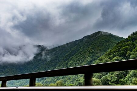 Scenic drive road trip on Blue Ridge Parkway in North Carolina Appalachian mountains. Mt Mitchell overlook observation point