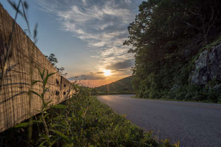 Bend in the road on the Blue Ridge Parkway with bright early morning sky.