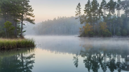 A serene dawn with a vibrant sky reflected in a calm lake, shrouded by mist. Generate AI
