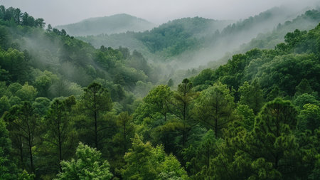 Misty Mountain Vista: Lush Green Forests and Dramatic Sky Landscape