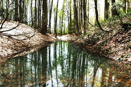 Beautiful lake in the forest with green trees and reflection in water