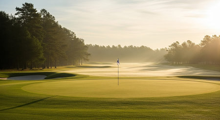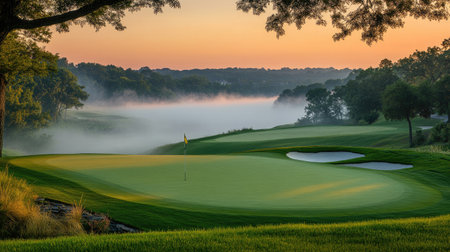 A serene golf course bathed in the warm glow of sunrise, with mist clinging to the manicured fairways and trees.