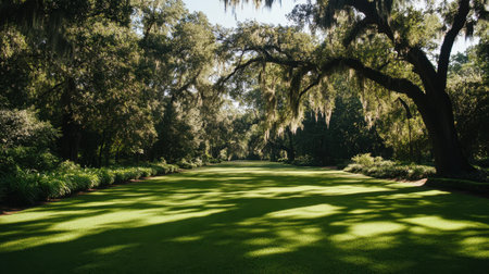 This image showcases a vast green lawn highlighted by majestic trees adorned with Spanish moss, creating a serene and tranquil atmosphere inspired by nature.
