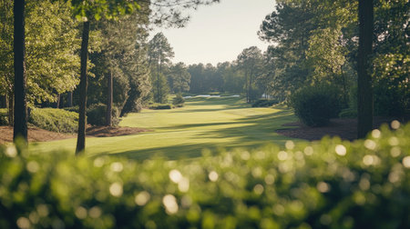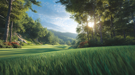 Experience the tranquility of a golf course landscape, featuring vibrant green grass, majestic trees, and soft sunlight filtering through a serene sky.