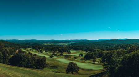 Picturesque golf course landscape with rolling hills and a clear blue sky