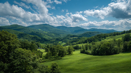 Experience the stunning beauty of a vast mountain landscape filled with lush green hills under a bright sky, perfect for adventurers and nature lovers.
